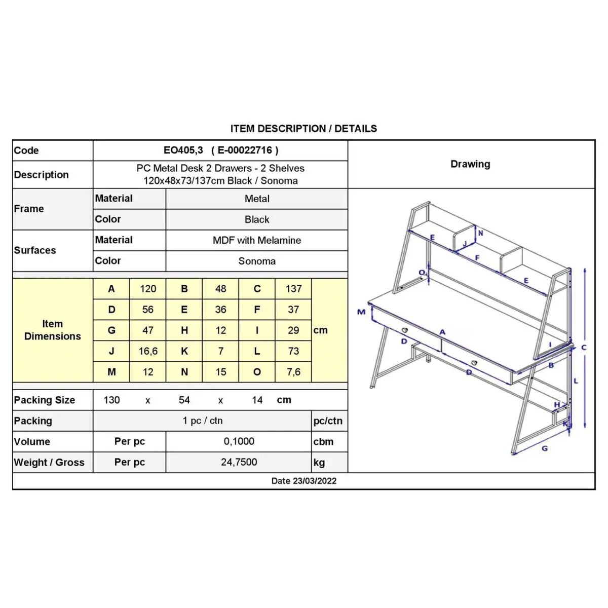 ΕΟ405,3 ΓΡΑΦΕΙΟ Η/Υ 2-Συρτ.2-Ράφια 120x48x73/137cm Μέταλ.Μαύρο/Sonoma