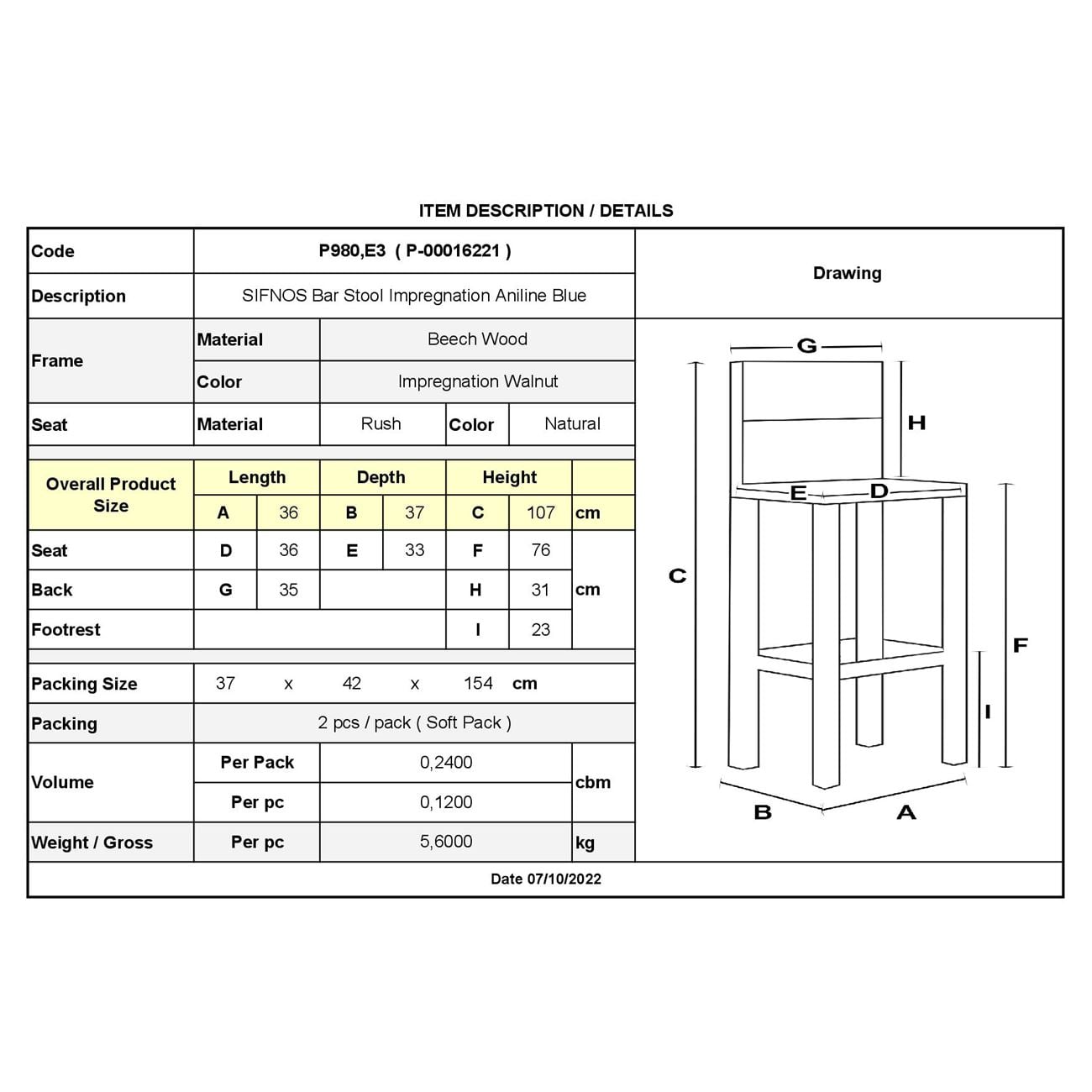 Ρ980,Ε3 ΣΙΦΝΟΣ Σκαμπό BAR 42R Ψάθα Εμποτ.Ανιλίνη Μπλε