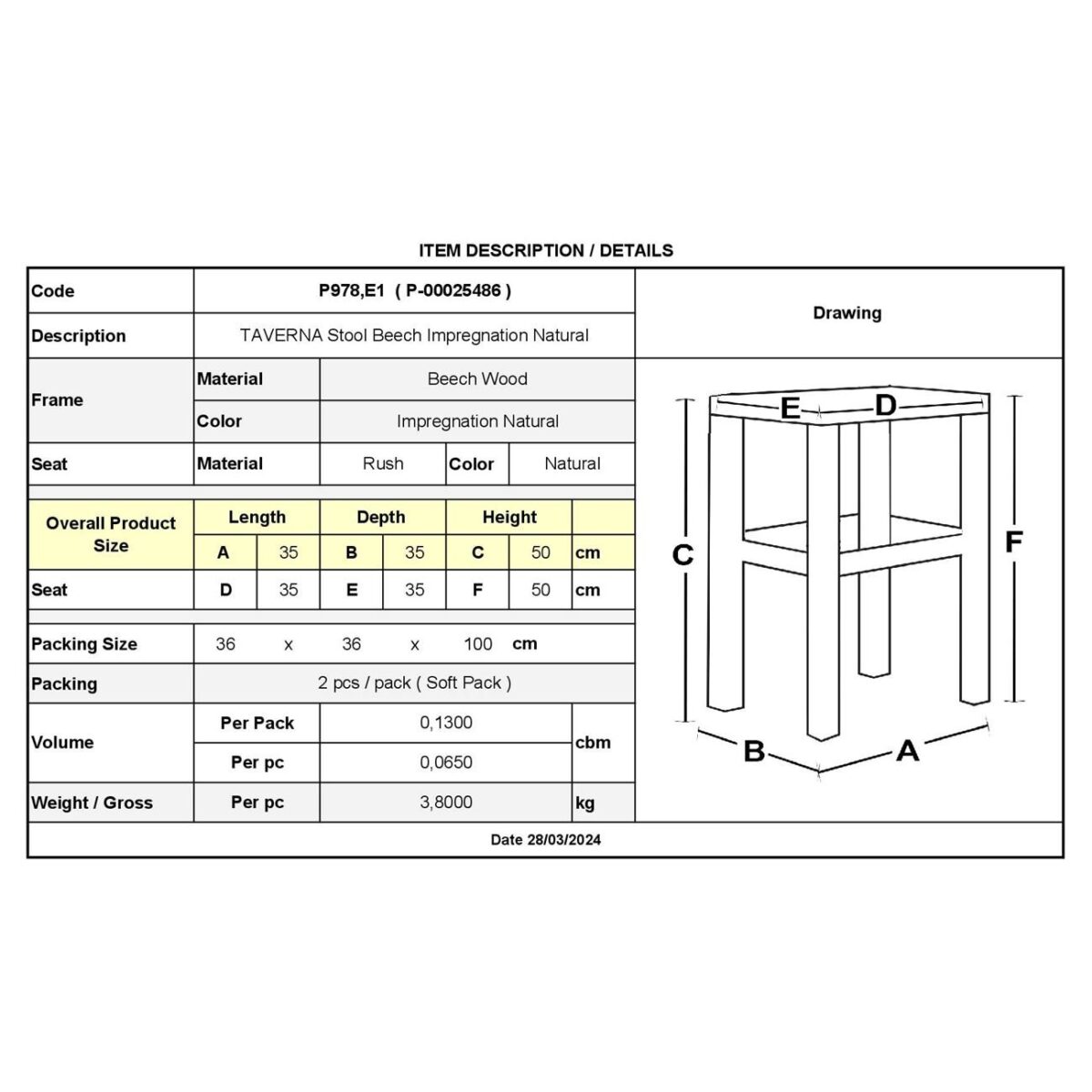 Ρ978,Ε1 ΤΑΒΕΡΝΑΣ Σκαμπό H50cm Ψάθα Εμποτ.Φυσικό
