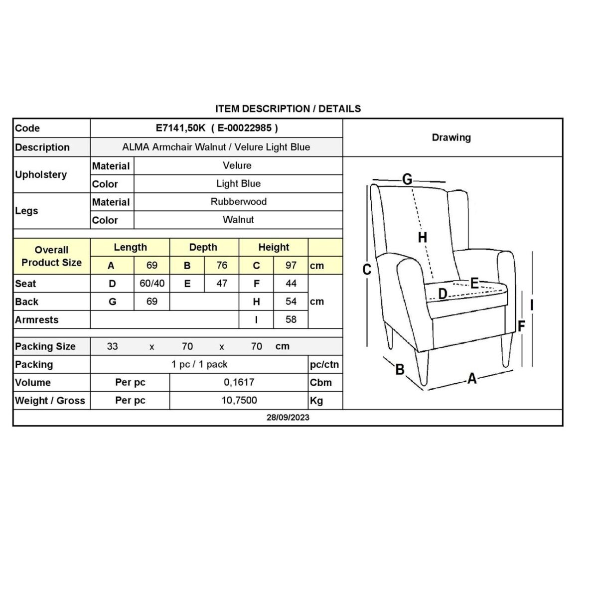 ALMA Πολυθρόνα – Μπερζέρα Σαλονιού – Καθιστικού Καρυδί Ύφασμα Ανοιχτό Μπλε Velure,K/D