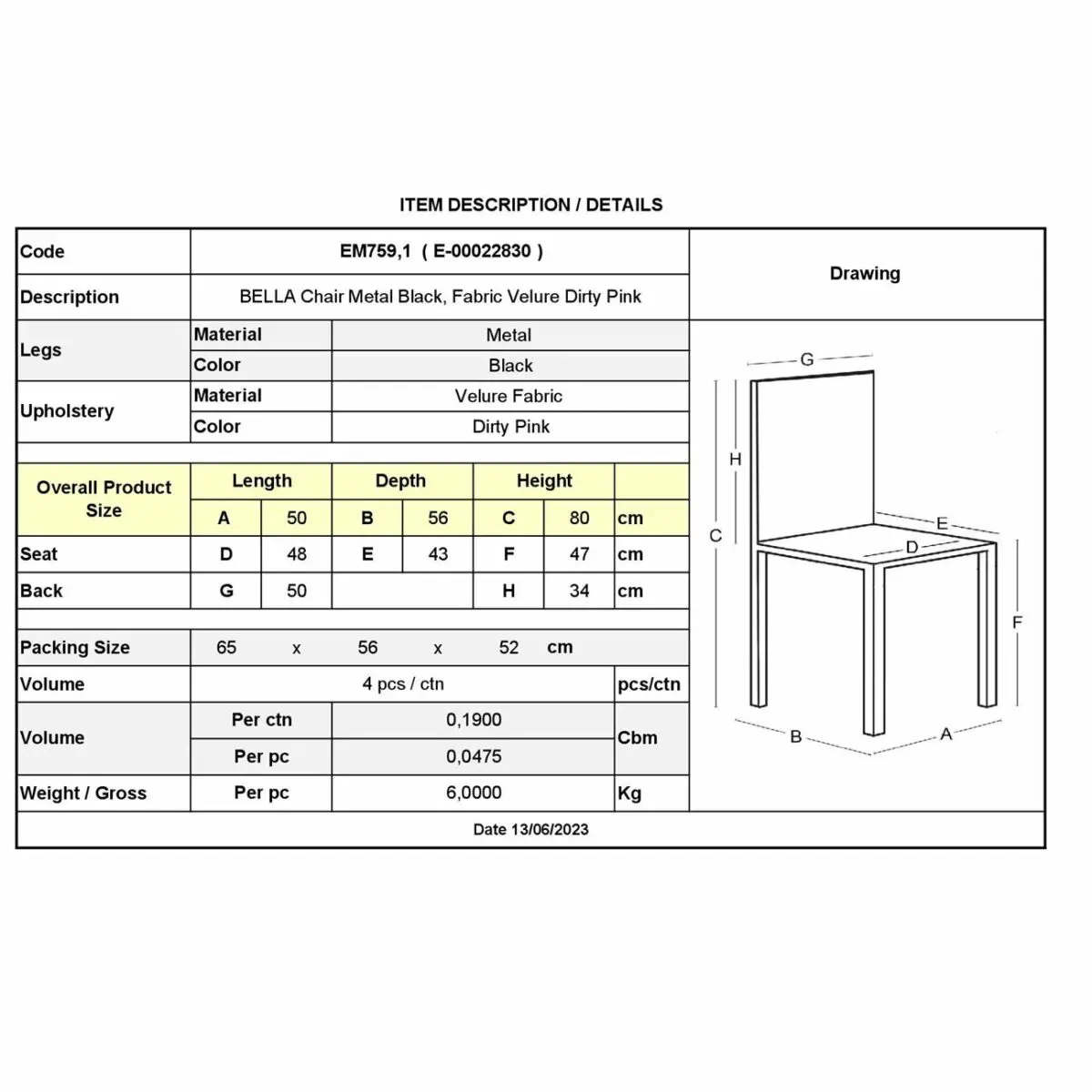 ΕΜ759,1 BELLA Καρέκλα Μέταλλο Μαύρο/Ύφασμα Velure Dirty Pink