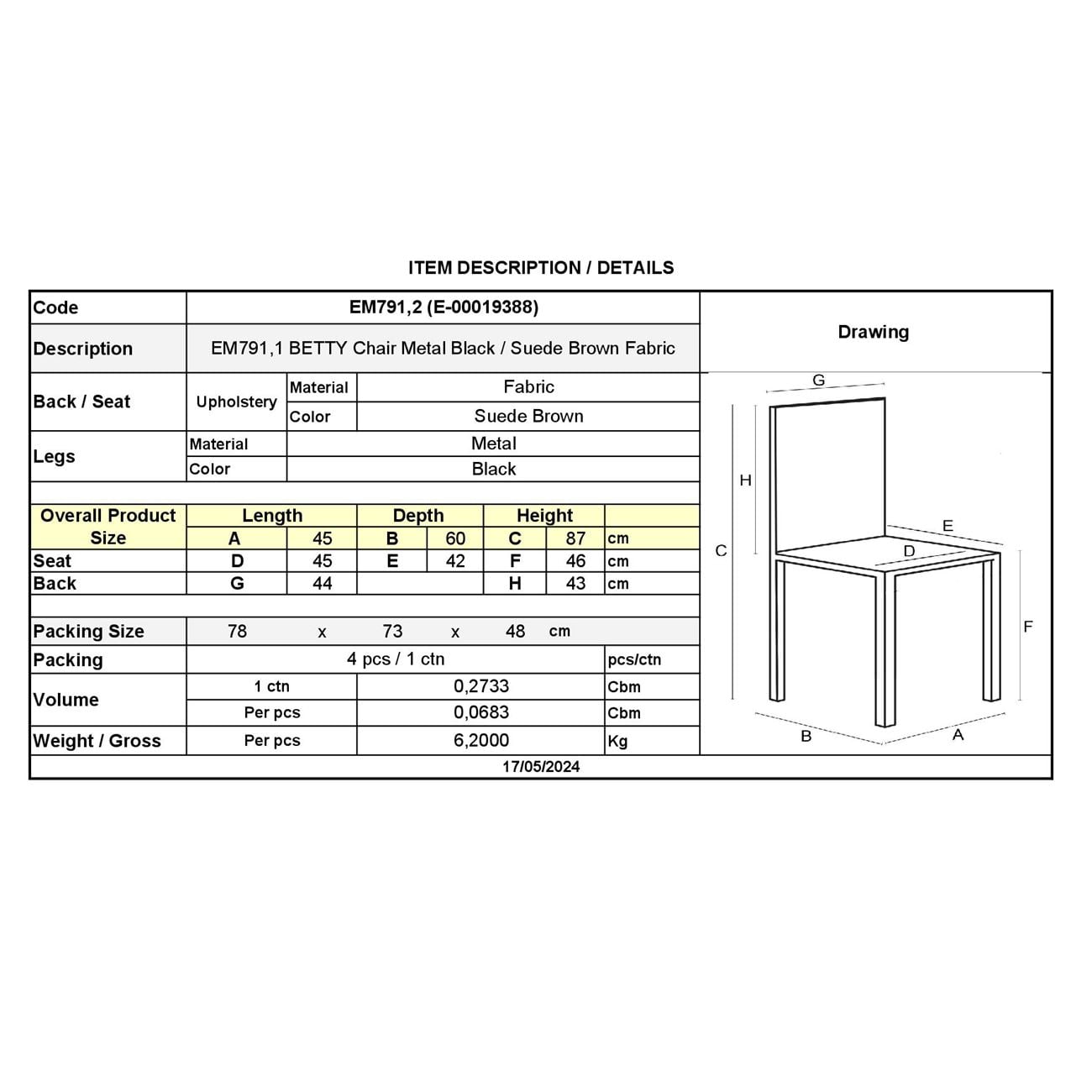 ΕΜ791,2 BETTY Καρέκλα Μέταλλο Μαύρο/Ύφασμα Suede Καφέ
