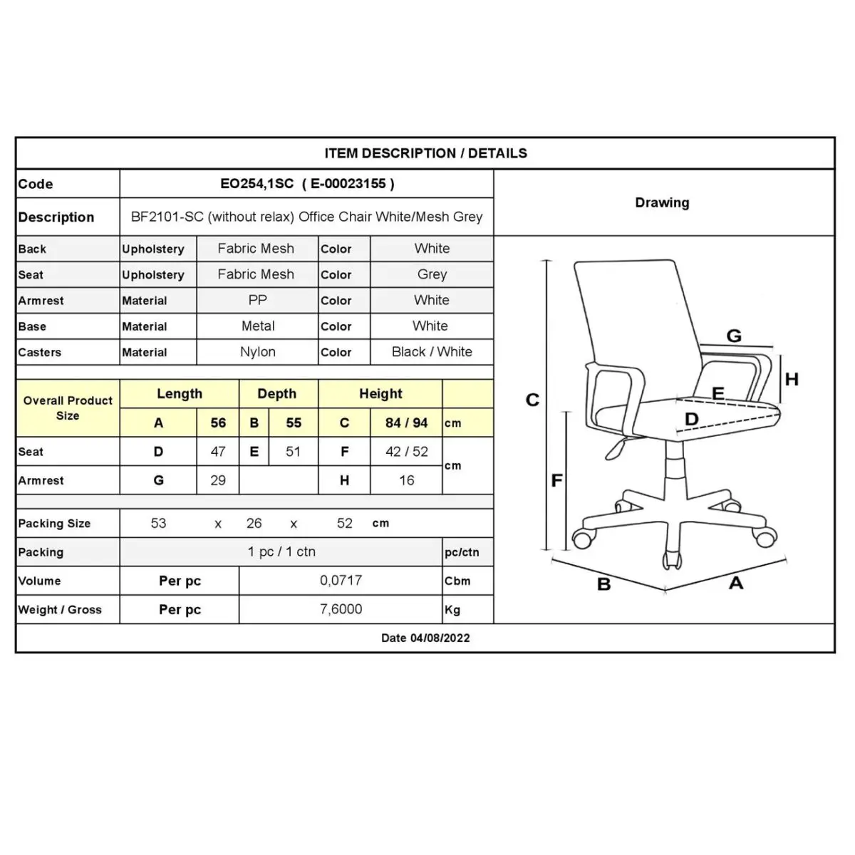 BF2101-SC Πολυθρόνα Γραφείου χωρίς Ανάκλιση Άσπρο – Mesh Γκρι (56x55x84/94cm)