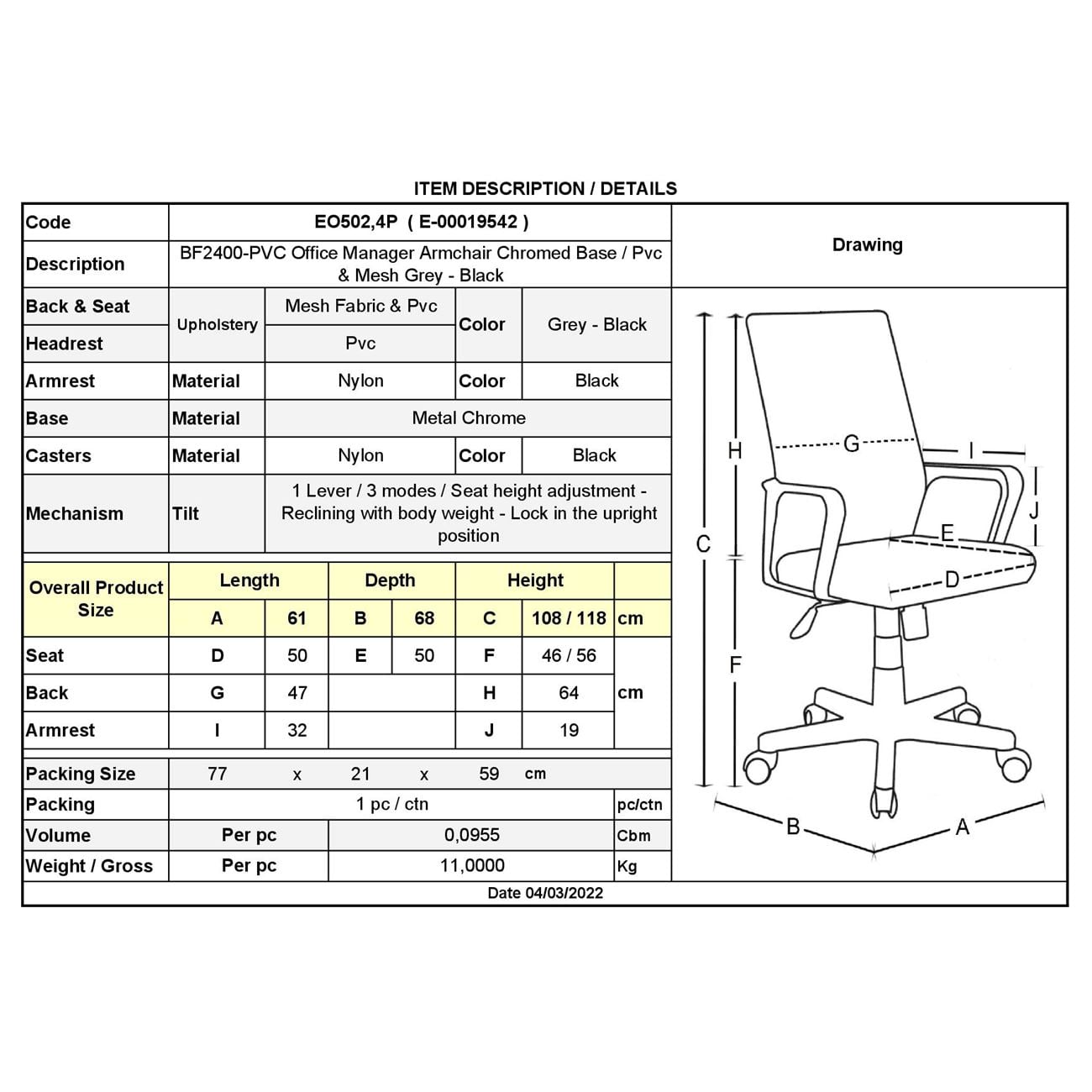 ΕΟ502,4P BF2400-PVC Πολυθρόνα Διευθυντή Χρώμιο/Pvc&Mesh Γκρι/Μαύρο