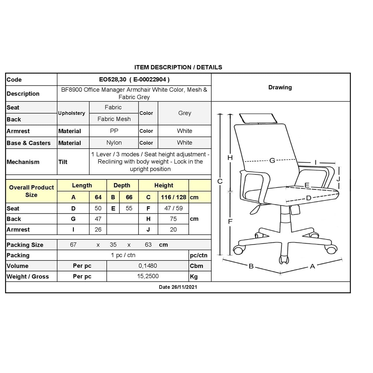 ΕΟ528,30 BF8900 Πολυθρόνα Διευθυντή Άσπρο / Mesh-Ύφασμα Γκρι