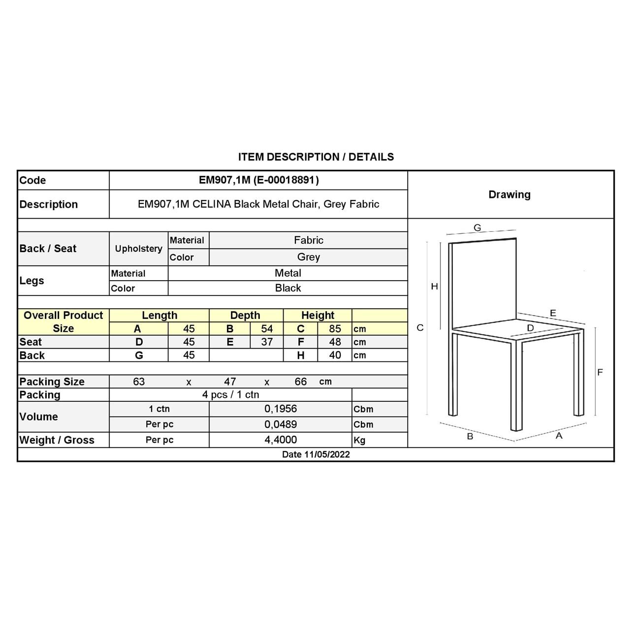ΕΜ907,1Μ CELINA Καρέκλα Μέταλλο Μαύρο/Ύφασμα Γκρι