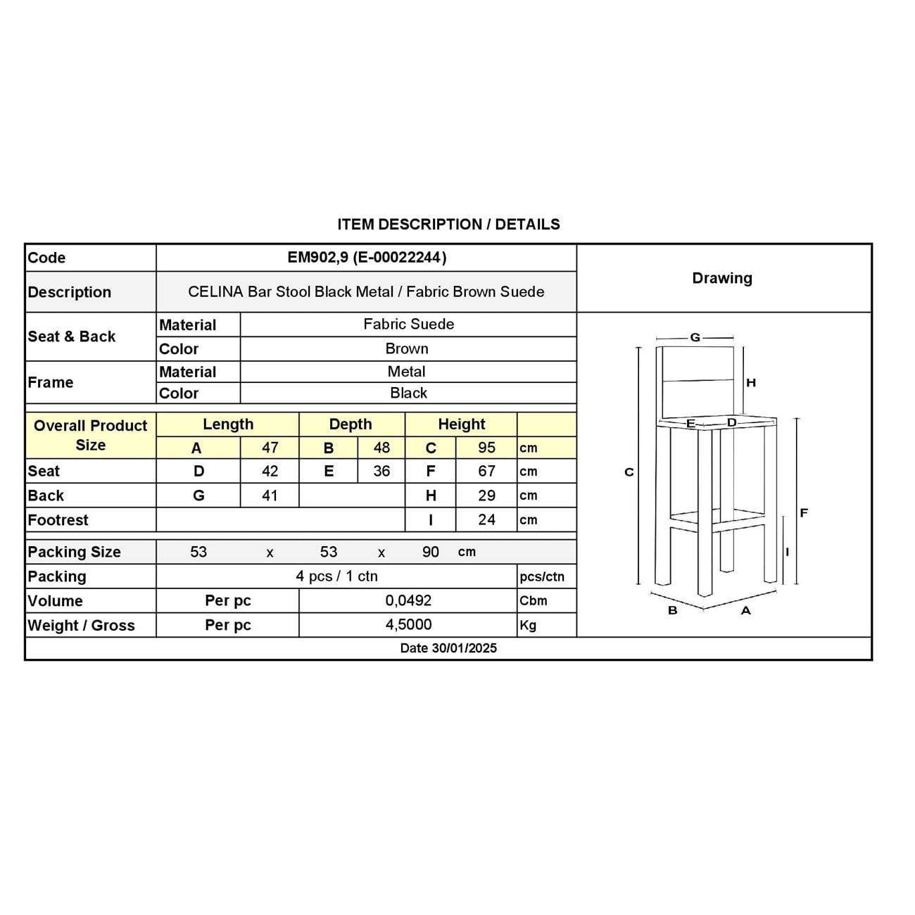 ΕΜ902,9 CELINA Σκαμπό Bar Μετ.Μαύρο, Ύφ.Suede Καφέ (ύψος καθ.67cm)