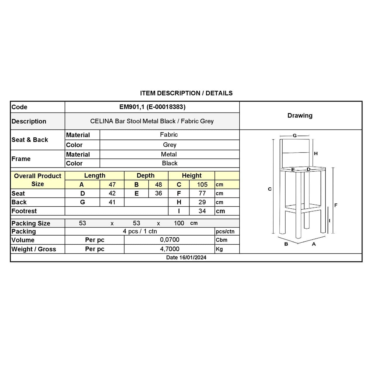 ΕΜ901,1 CELINA Σκαμπό BAR Μεταλ.Μαύρο, Ύφ.Γκρι