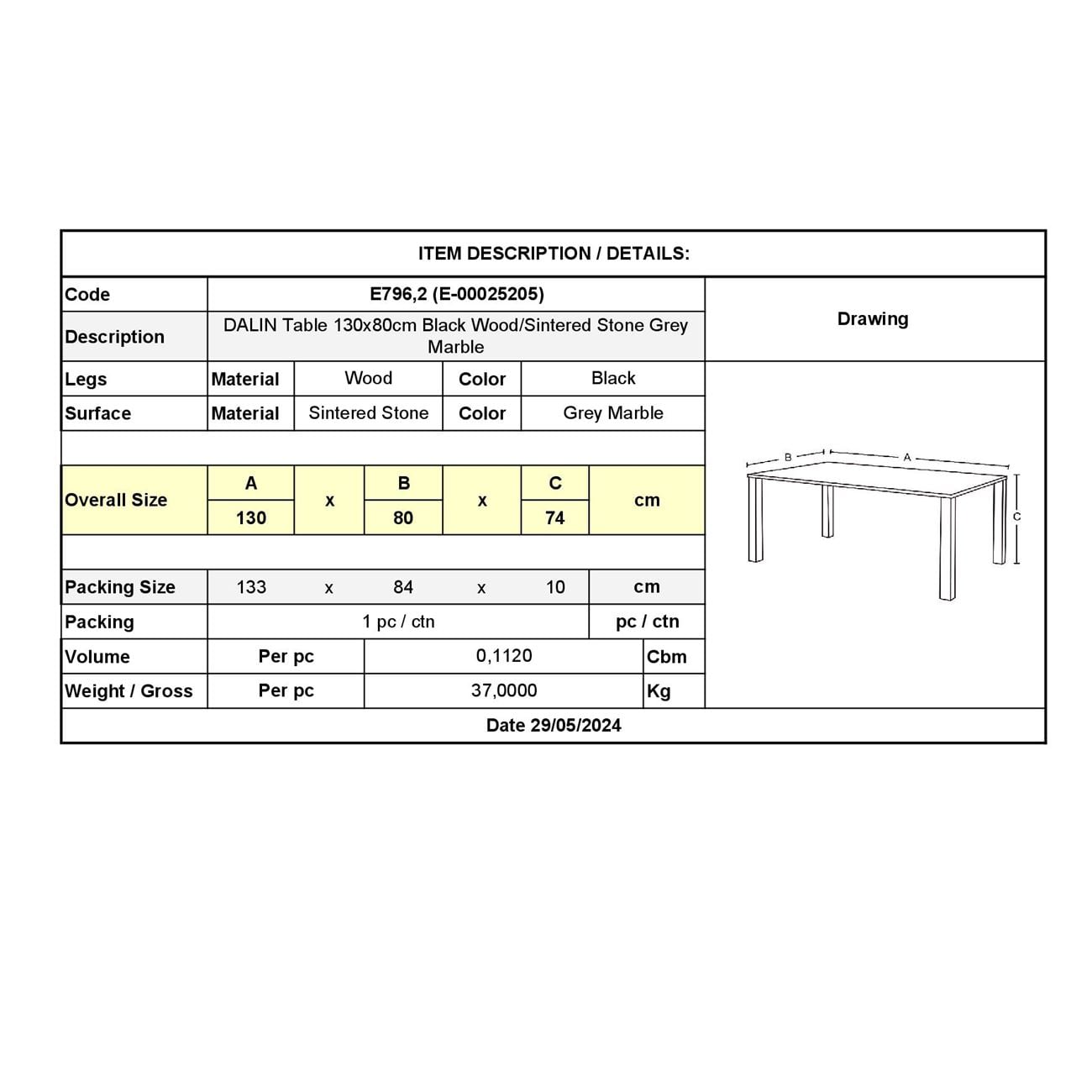 DALIN Τραπέζι Τραπεζαρίας- Κουζίνας, Ξύλο Μαύρο-Επιφάνεια Sintered Stone Grey Marble