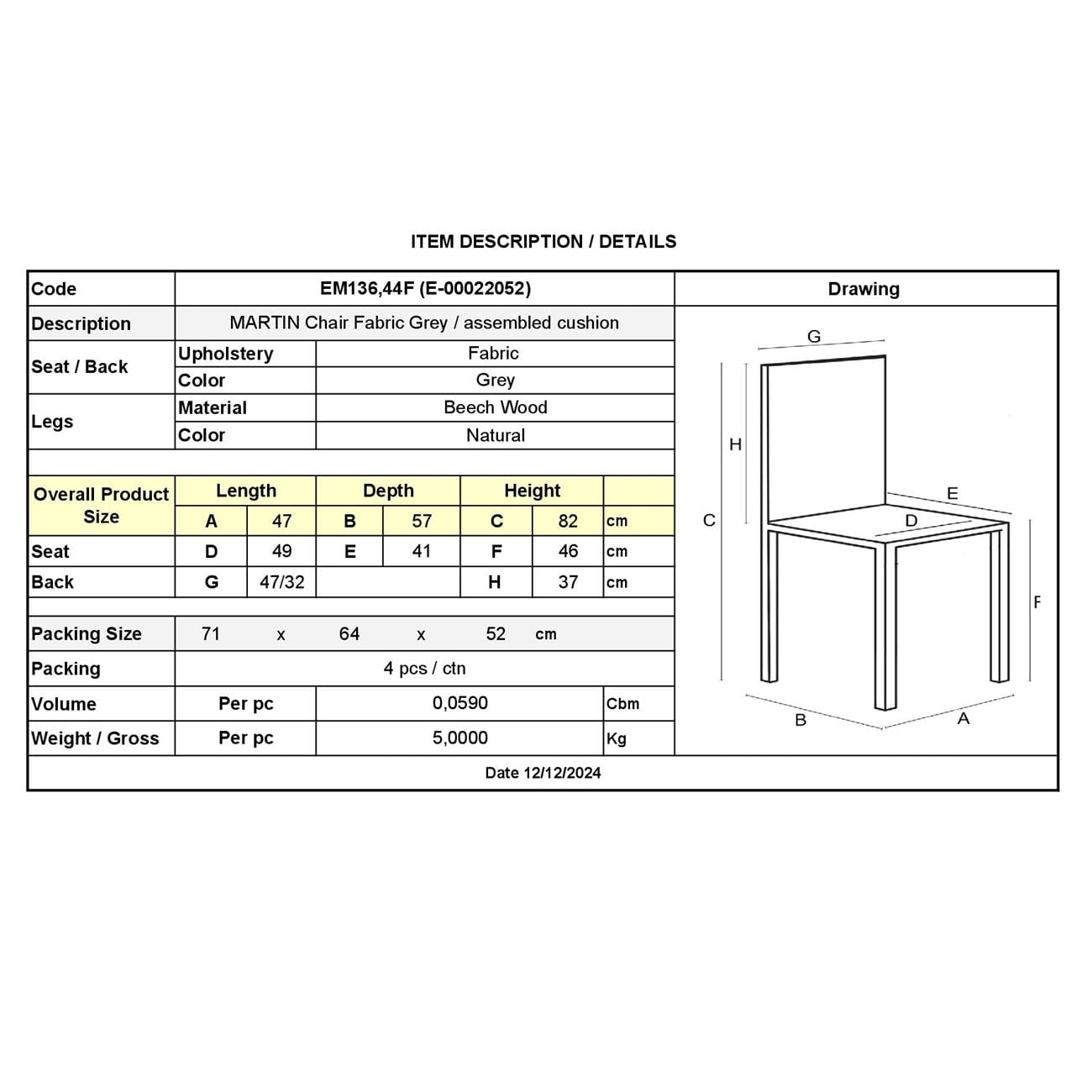 MARTIN Καρέκλα Οξιά Φυσικό, Ύφασμα Γκρι, Μονταρισμένη Ταπετσαρία (49x57x82cm)