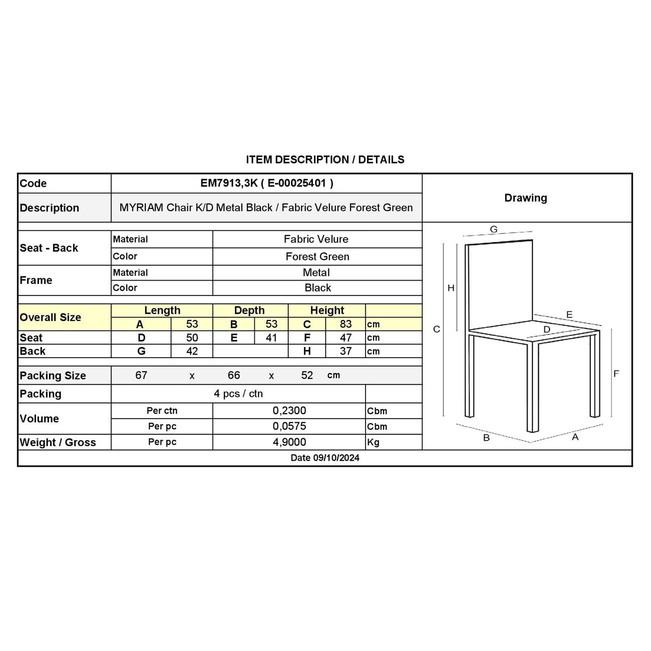 ΕΜ7913,3Κ MYRIAM Καρέκλα K/D Μέταλ.Μαύρο/Ύφασμα Velure Forest Green (Συσκ.4)