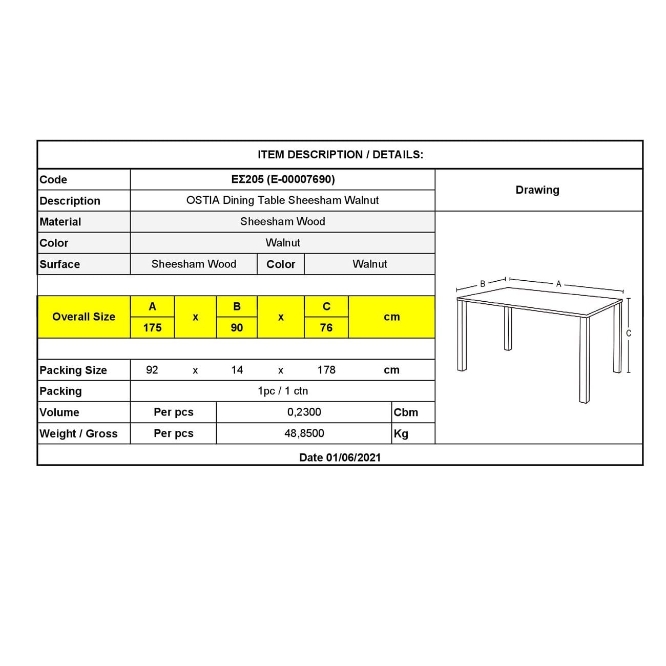 ΕS205 OSTIA Τραπέζι 175x90cm, Sheesham Καρυδί
